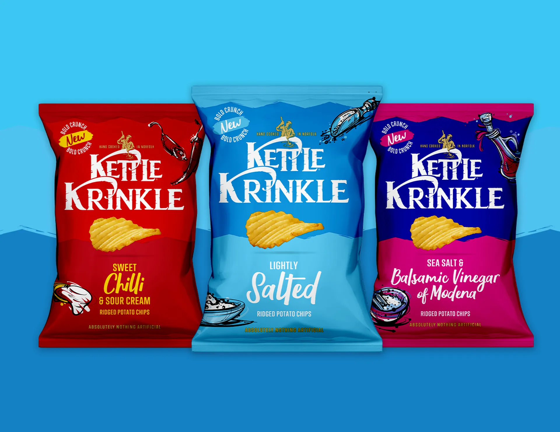 The new KETTLE® Krinkle range introduces a fun, innovative format to the brand, offering core KETTLE® flavors in a ridged potato chip. These hand-cooked chips maintain KETTLE®’s commitment to premium quality and signature taste, but feature "thick ridges" to deliver a "Bold Crunch," with the 'K' in Krinkle nodding to the brand's iconic identity